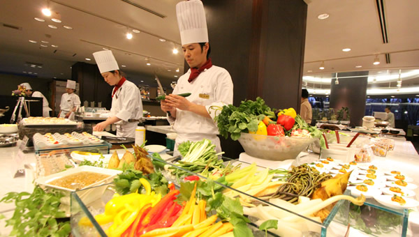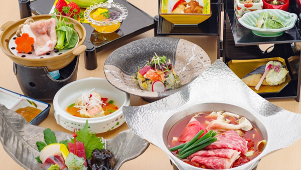 夕食(別途料金) | 和食/ 洋食/ バイキング 「新鮮野菜を多く使用したフランス料理」、「地産地消にこだわった和食会席」、「和洋中90種の豪華バイキング」。ルームサービス(和食または洋食) |