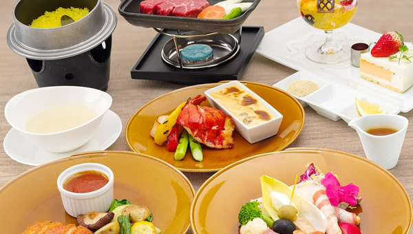ルームサービス以外では、約90種類以上の料理が並び、旬の野菜を主役にしたベジタブルガーデンや、シェフによるライブパフォーマンス、那須高原の乳製品にこだわったスイーツなど盛りだくさん。本館レストランもご利用可能。(ペット不可)