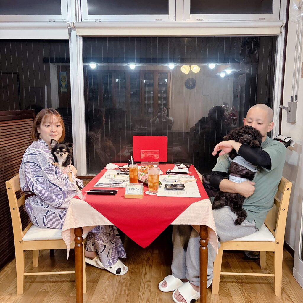 今まで泊まった宿泊施設は ペットは食事の時はお部屋でお留守番が当たり前だったのですが,今回初の同伴OKだったので 部屋に置いてきたっという不安もなく急いで摂ることなく 和洋折衷沢山のお食事をゆ~っくり愉しめたので(一番最初に席に着いても席を立つのはビリでした) ワンコ自身もリラックスしてたので人も時間を気にすることなく話しも弾み,幼馴染みとの初旅行が有意義なものになりました