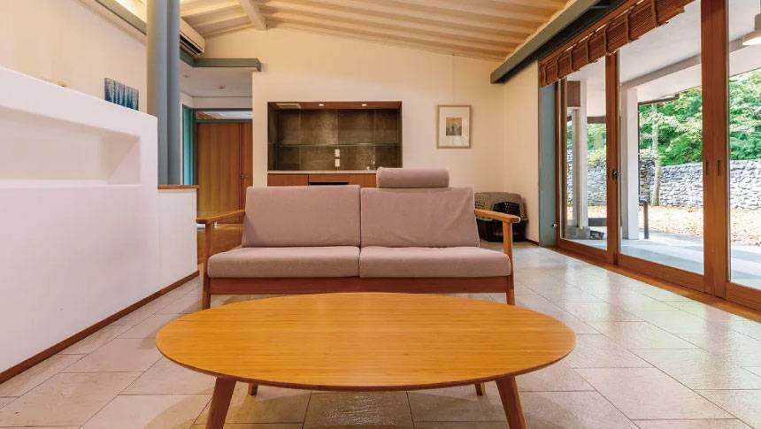 一軒家スタイルの温泉付きのヴィラスイート7棟、高台から由布院の里山を見晴らす場所に立つ メゾネットタイプのテラススイート8室をご用意。 くぬぎの杜と竹林に包まれた全15室の客室は、全室温泉付きの癒しの空間が広がります。
