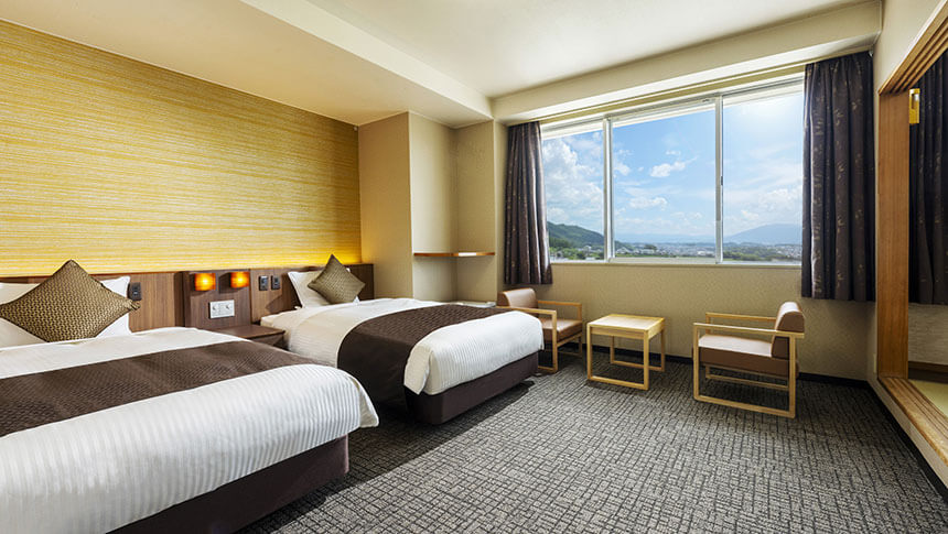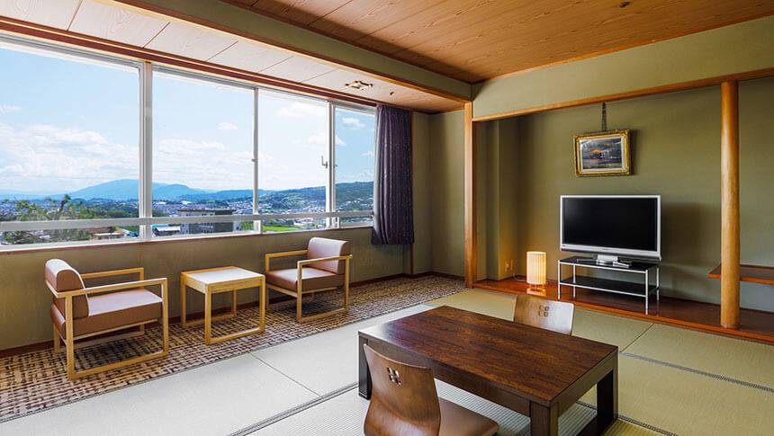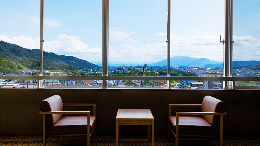 東は矢田丘陵、西は生駒山地の豊かな緑に囲まれ、四季折々の新緑や紅葉、豊かな眺望が客室からお楽しみいただけます。