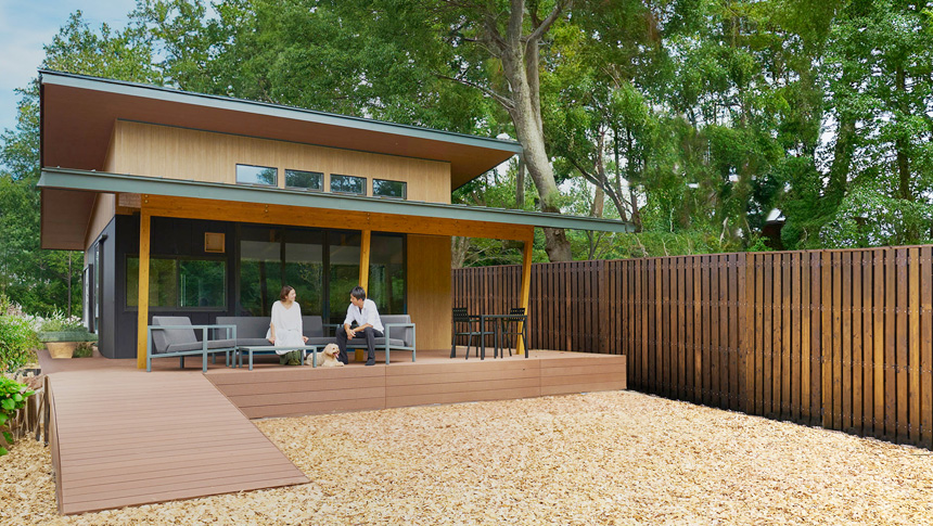 52㎡のゆとりのあるヴィラには、客室プライベート温泉を備え、デッキテラスやウッドチップのドッグランなど