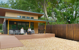 フレンドハウスひるがの|澄み切った青空が広がる日、木の温かみが感じられる2棟のコテージが並んでいる。手前には、手入れされた砂利道と木のラティスフェンスがある