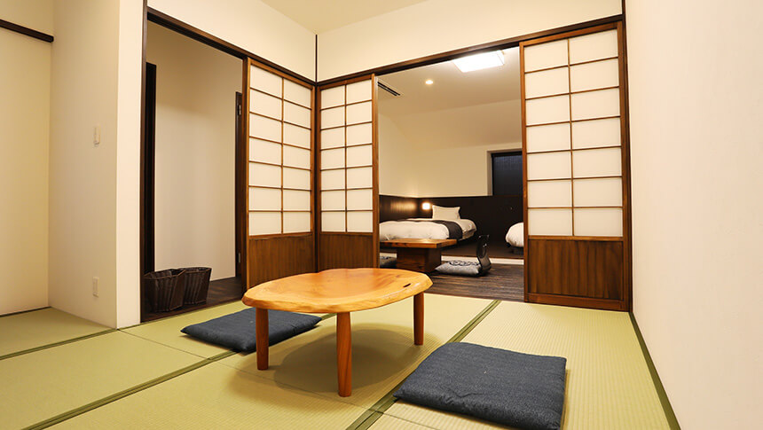 2~4名様にご利用いただける35㎡以上の客室タイプ「香花灯-こうかとう」。どこか懐かしくあたたかい古民家調の二間です。愛犬と一緒にゆったりとお寛ぎください。