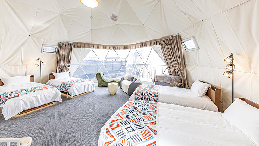 1棟あたり: 収容6人 ドームテント2つ(それぞれ寝室、室内ドッグラン兼フリーバー)、サニタリールームにトイレ、温泉バスルーム、シャワールーム、洗面、脱衣室完備