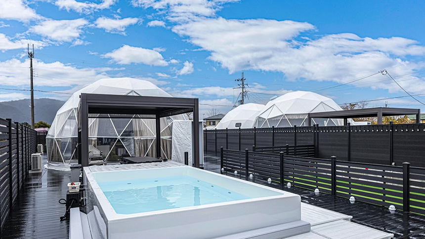 天然温泉・サウナ・ジャグジー付きの贅沢グランピング。広々とした敷地と室内ドッグランで、愛犬ものびのび。雨や雪の日も快適に過ごせる、特別なドッグプレミアム体験。