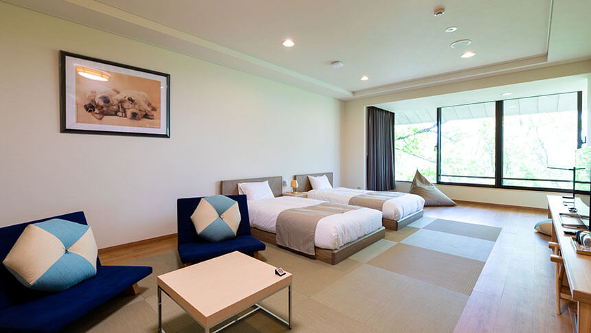 15室のゲストルームはお部屋でゆっくり過ごしていただけるよう、十分な広さを確保しております。その他、澄んだ森の息吹を感じていただけるテラスカフェや囲炉裏バー、自家源泉から溢れる温泉、3カ所のドッグラン等、エリアNO1の充実した設備とホスピタリティでおもてなしいたします。