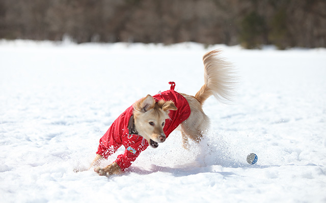 雪遊びをするなら、愛犬の足に雪玉が着くこともあるので、事前に服を着せたり、靴を履かせたり、オイルやクリームを塗って保護するなど対策も必要です。