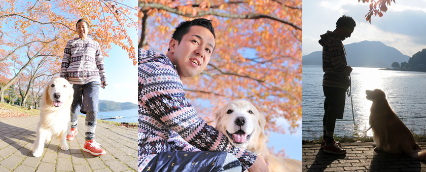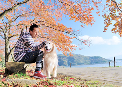 レジーナリゾート富士を出発して河口湖畔へ。宿泊体験の時はちょうど紅葉の見ごろをむかえて鮮やかな紅葉の中でのお散歩となりました。あいにくこの日は富士山に雲がかかり見ることができませんでしたが、ベンチに座ってのんびりしていると湖面に反射した太陽光がとても美しく輝き、ステキな写真を撮ることができました。素晴らしい景色にシャルロットも楽しんでいるようです。冬には雪景色、春には新緑と季節ごとに訪れたくなる口湖畔。撮影スポットも多く、三脚などあると便利ですよ! |